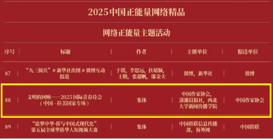 3月29日,由中央网信办主办的2025中国正能量网络精品征集展播活动评选结果正式揭晓,我校与中国作家协会、潇湘晨报社联合申报的《文明的回响——2025国际青春诗会(中国—拉美国家专场)》获评“网络正能量主题活动”。