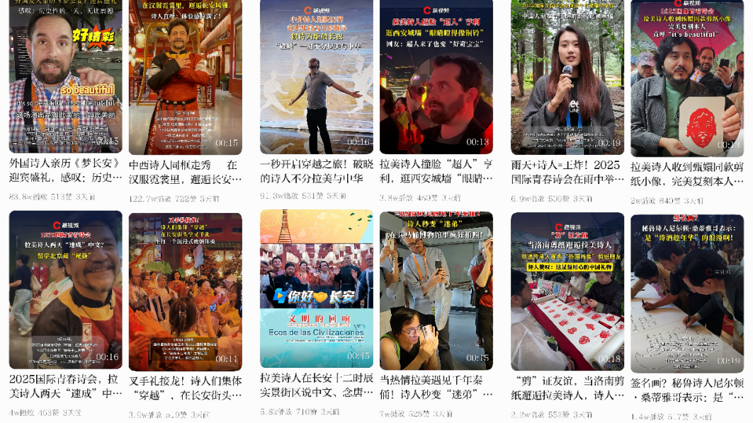 活动期间,中国作协、潇湘晨报社与我校深度合作,选拔新闻传播学院六名学生加入报道团,全程参与活动报道。我校学生以青春视角敏锐捕捉活动现场的生动细节,连续推出了“拉美诗人的‘速成’中文”“中拉翻译官联手‘搭桥’”“墨西哥诗人cos乐舞佣”“杜虎符前的趣味猜想”“拉美诗人为秦兵马俑即兴作诗”“可爱李白《将进酒》圈粉拉美诗人”“大学生与拉美诗人的跨国忘年交”等数十个有故事、有温度又有流量的短视频作品,极大提升了此次诗会的网络热度与传播声量。