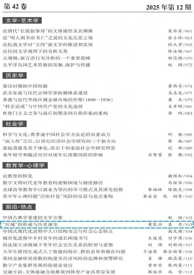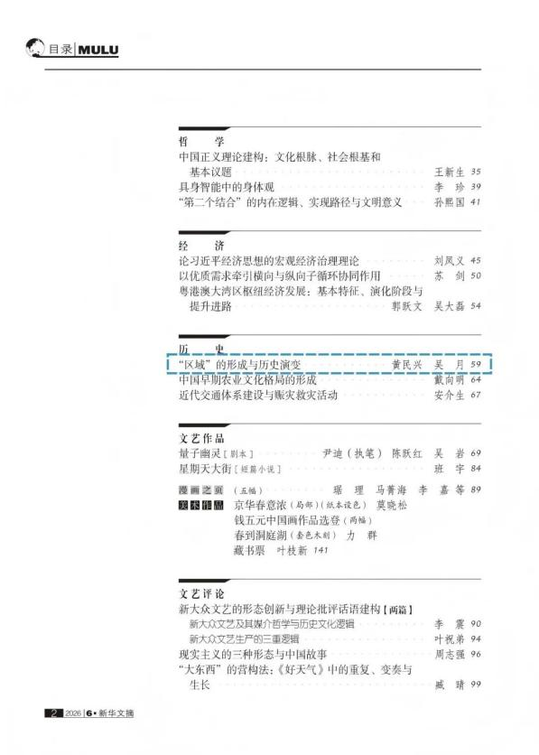 《西北大学学报(哲学社会科学版)》2025年第6期“区域国别学特辑”刊发的西北大学区域国别学院黄民兴教授及博士生吴月的论文《论区域国别学视域下“区域”的形成与历史演变》被《新华文摘》2026年第6期作为封面文章全文转载。同时,被《高等学校文科学术文摘》2025年第12期全文转载。
