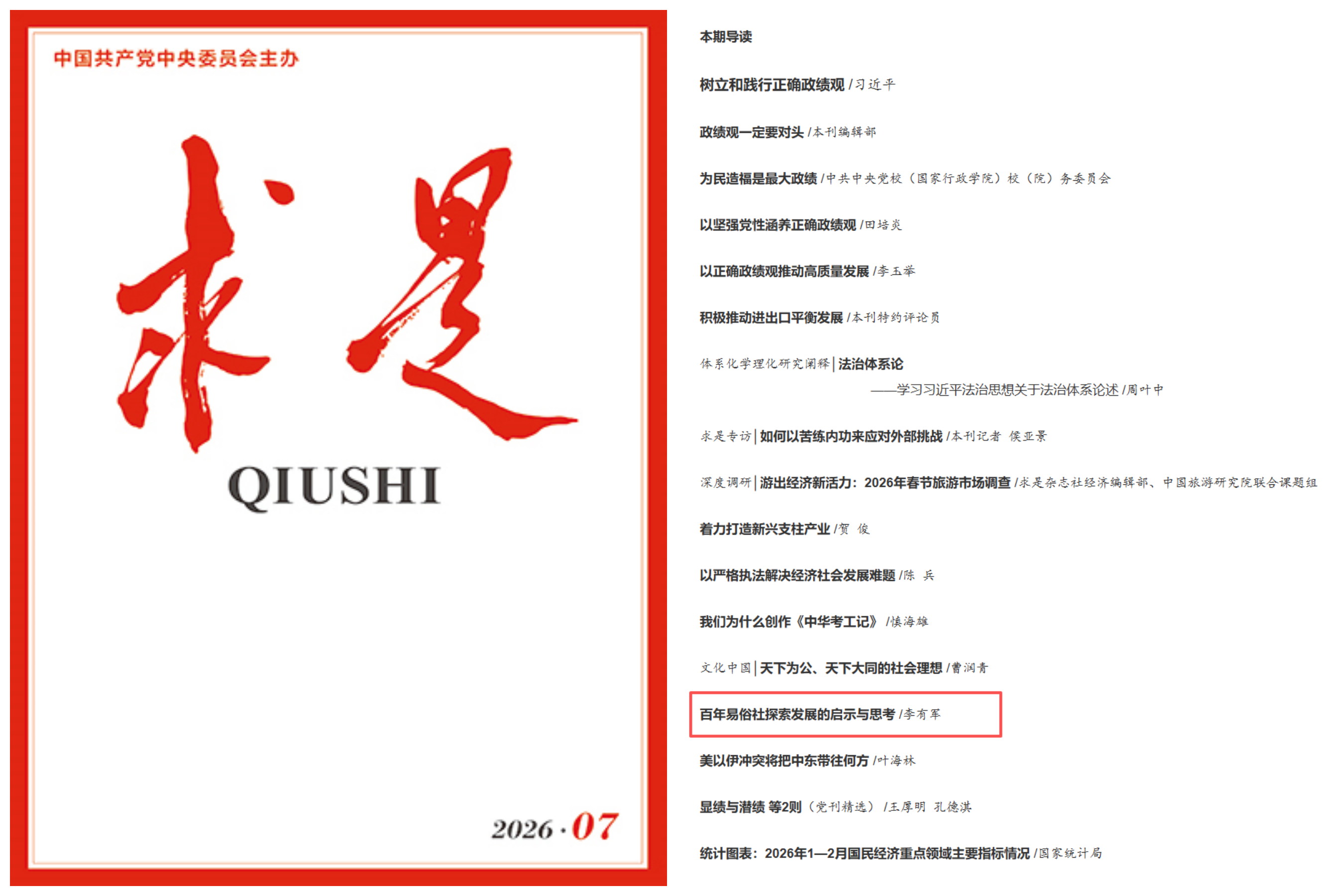 4月1日,《求是》杂志2026年第7期刊发了我校文学院李有军教授论文《百年易俗社探索发展的启示与思考》。