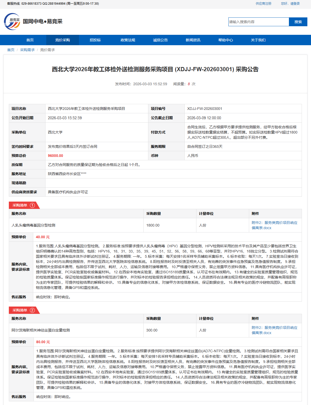 西北大学2026年教工体检外送检测服务采购项目(XDJJ-FW-202603001)竞价采购公告