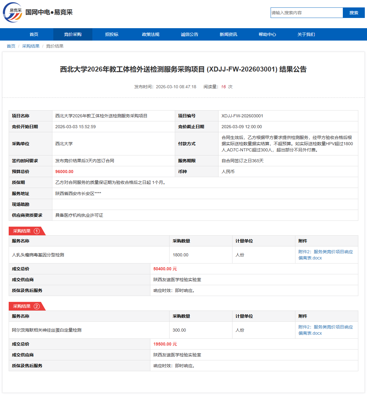 西北大学2026年教工体检外送检测服务采购项目(XDJJ-FW-202603001)竞价结果公告