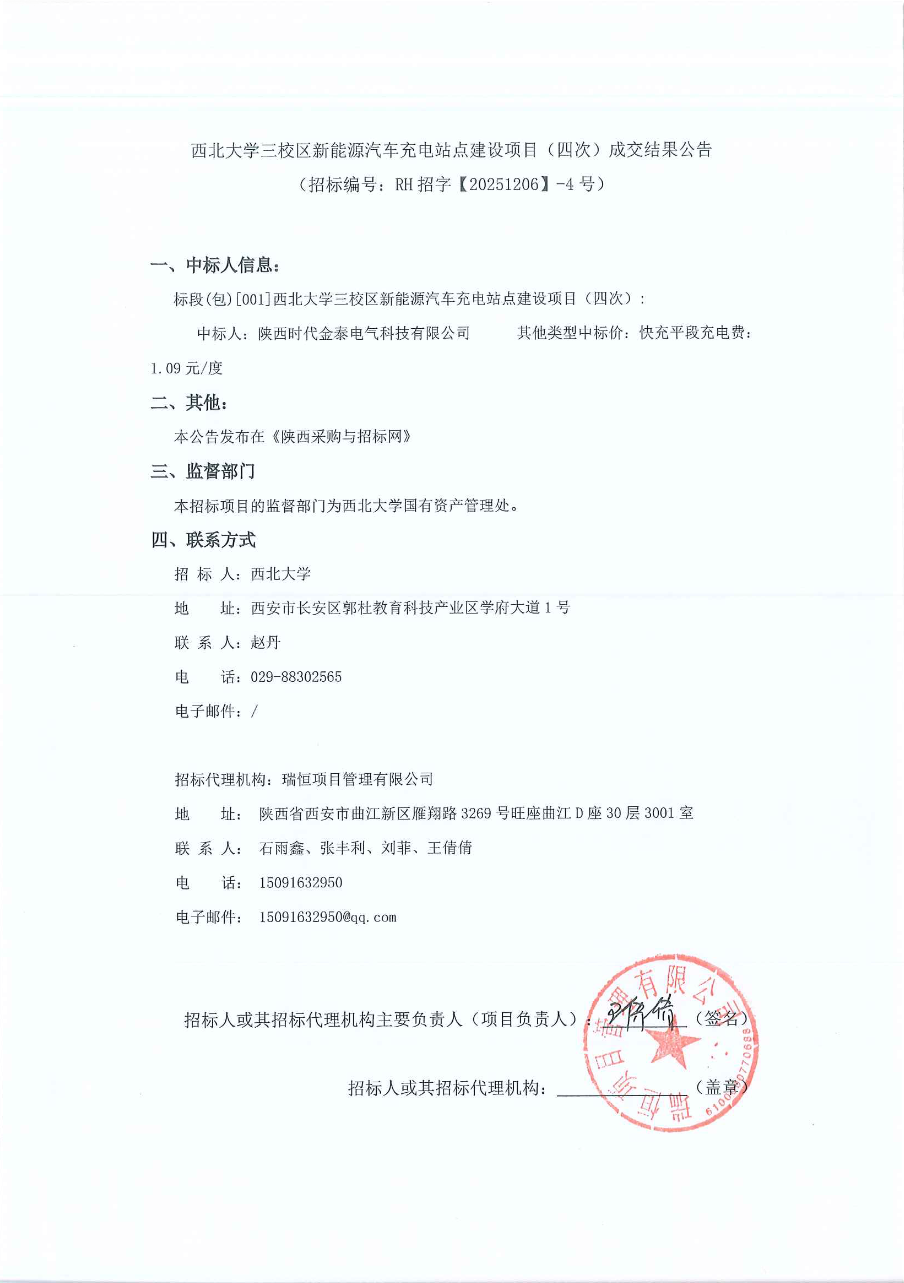 西北大学三校区新能源汽车充电站点建设项目(四次)成交结果公告