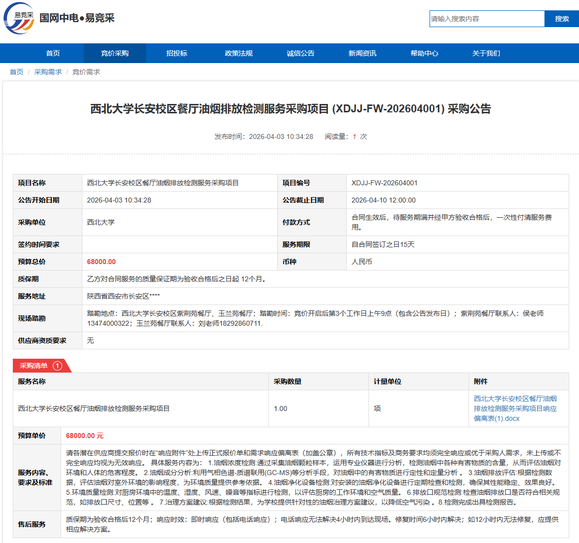 西北大学长安校区餐厅油烟排放检测服务采购项目(XDJJ-FW-202604001)竞价采购公告