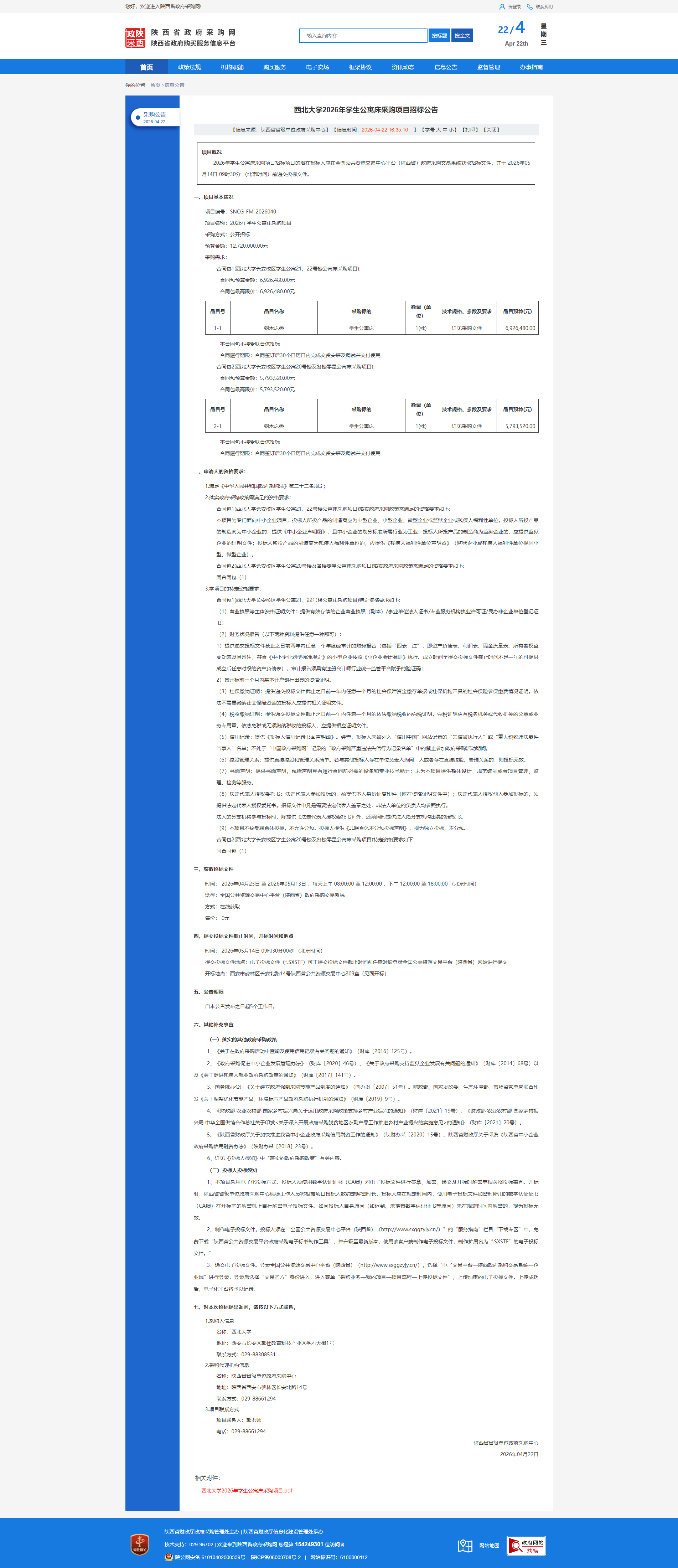 西北大学2026年学生公寓床采购项目招标公告
