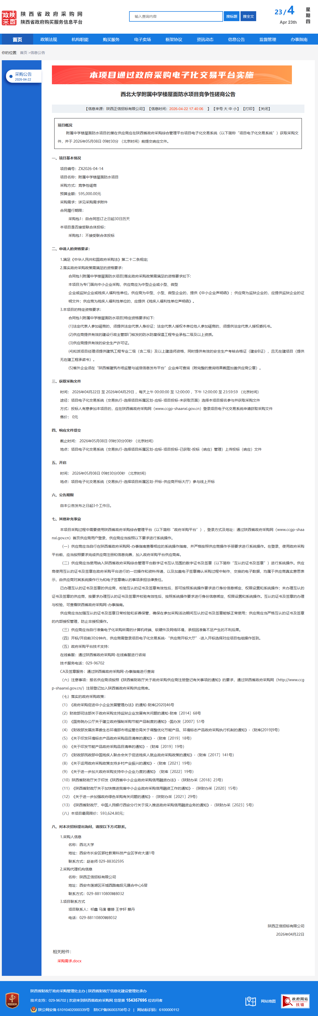 西北大学附属中学楼屋面防水项目竞争性磋商公告