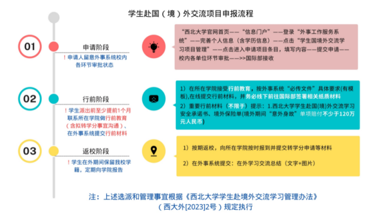 1.【校内申请】:有意向申报学生于5月10日前完成西北大学外事工作服务系统的在线申请,并跟进系统审核进度,在5月15日前获得除国际部外校内单位审批。