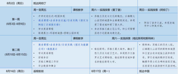 在阿伯丁这座英国最安全、最友好的大学城之一,度过两周沉浸式学习时光。本项目聚焦商务课程学习和行业实践,辅之以学术英语小班课,帮助参与者提升沟通技巧,同时深入了解苏格兰的创新和企业生态系统。