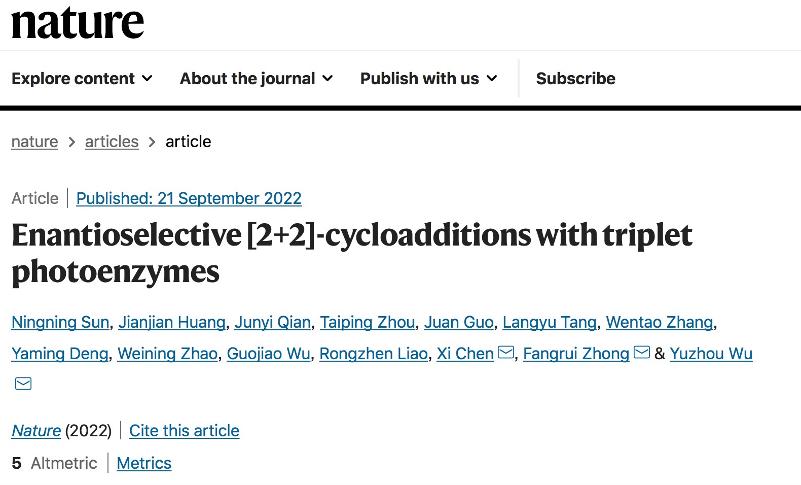 日前,我校化学与材料科学学院陈希教授与华中科技大学吴钰周、钟芳锐教授合作,以共同通讯作者在Nature主刊在线发表文章“Enantioselective [2+2]-cycloadditions with triplet photoenzymes”。酶是生命体重要的组成部分。酶催化具有高效、高度空间立体选择性和绿色环保特性。近些年来,对酶的改造和定向进化在合成生物学领域有许多突破,但对于酶的高效光催化鲜有报道。这项工作是酶催化光化学领域的关键性突破。研究者将三线...