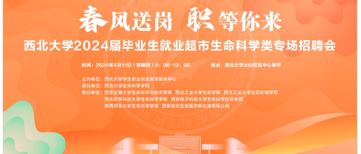 为深入贯彻落实党中央、国务院“稳就业”“保就业”决策部署,抓好春季促就业工作关键阶段,全力推动2024届毕业生高质量充分就业,4月11日上午,由学校学生就业创业指导服务中心主办,生命科学学院承办,西安交通大学生命科学与技术学院、西北工业大学生命学院、西北工业大学生态环境学院、西北农林科技大学生命科学学院、西安电子科技大学生命科学技术学院、陕西师范大学生命科学学院、西安联创生物医药孵化器共同协办的西北大...