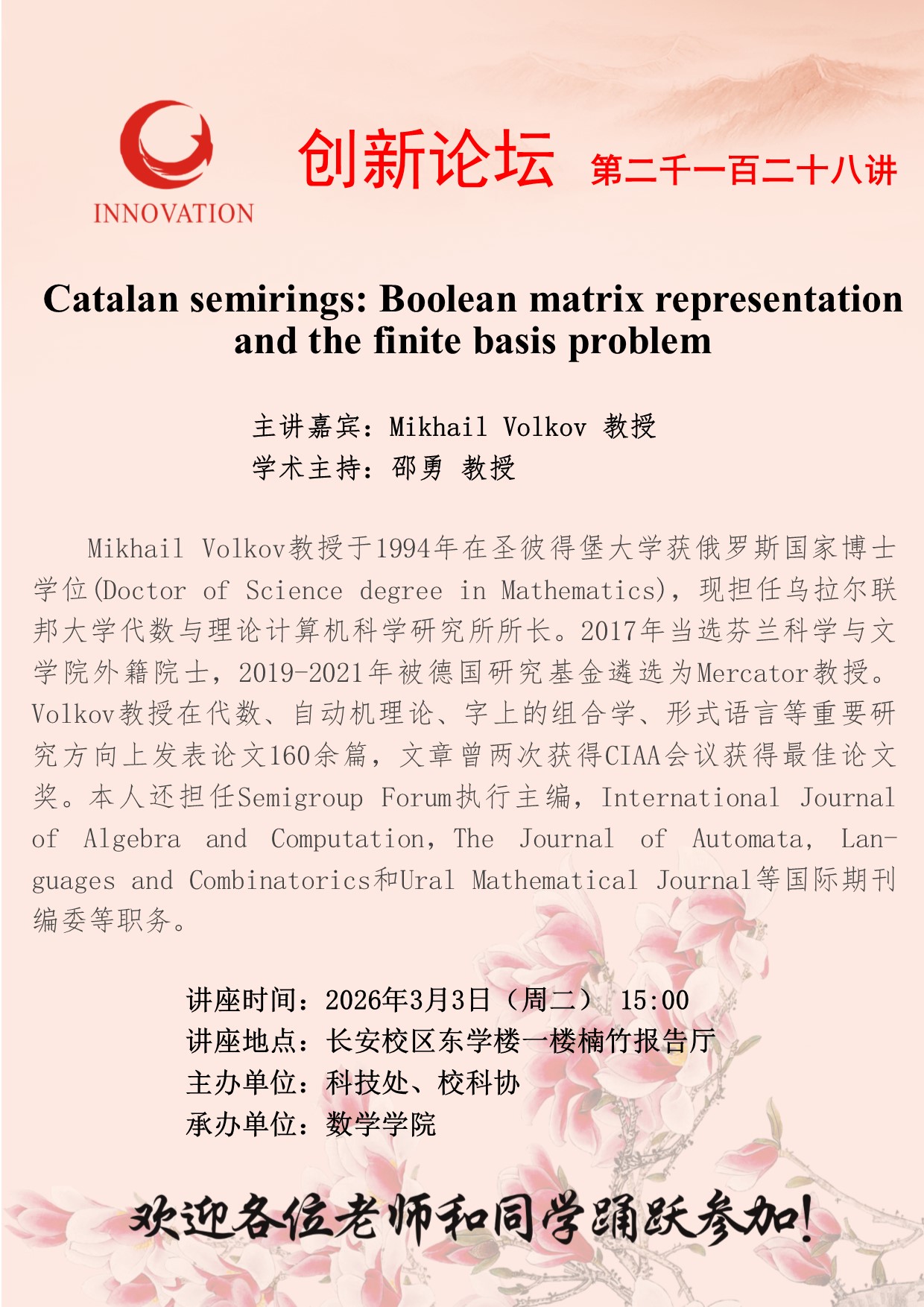 西北大学创新论坛第二千一百二十八讲:Catalan semirings: Boolean matrix representation and the finite basis problem