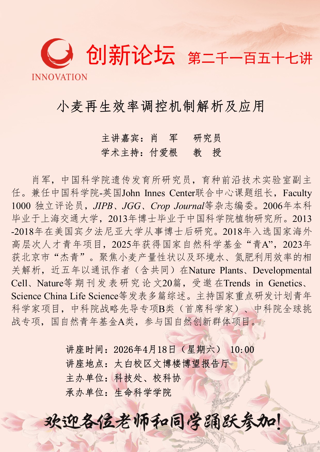 下一篇:西北大学创新论坛第二千一百五十六讲:植物成花素激活复合物的多维动态组装机制研究
