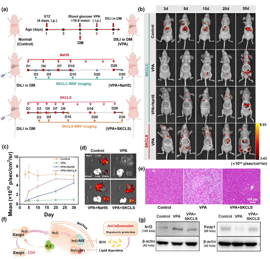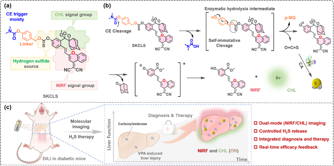 近日,我校郭媛教授/张健健教授团队在糖尿病并发药物性肝损伤(DILI)的诊疗一体化研究中取得重要进展。该团队成功构建了一种羧酸酯酶(CE)激活型硫化氢(H₂S)供体(SKCLS)分子药物策略,该策略同时集成了近红外荧光(NIRF)与化学发光(CHL)双模态成像功能,可实现对糖尿病小鼠模型中DILI进程的精准可视化监测与有效治疗,为临床解决糖尿病用药所致肝毒性问题提供了新的方案。
