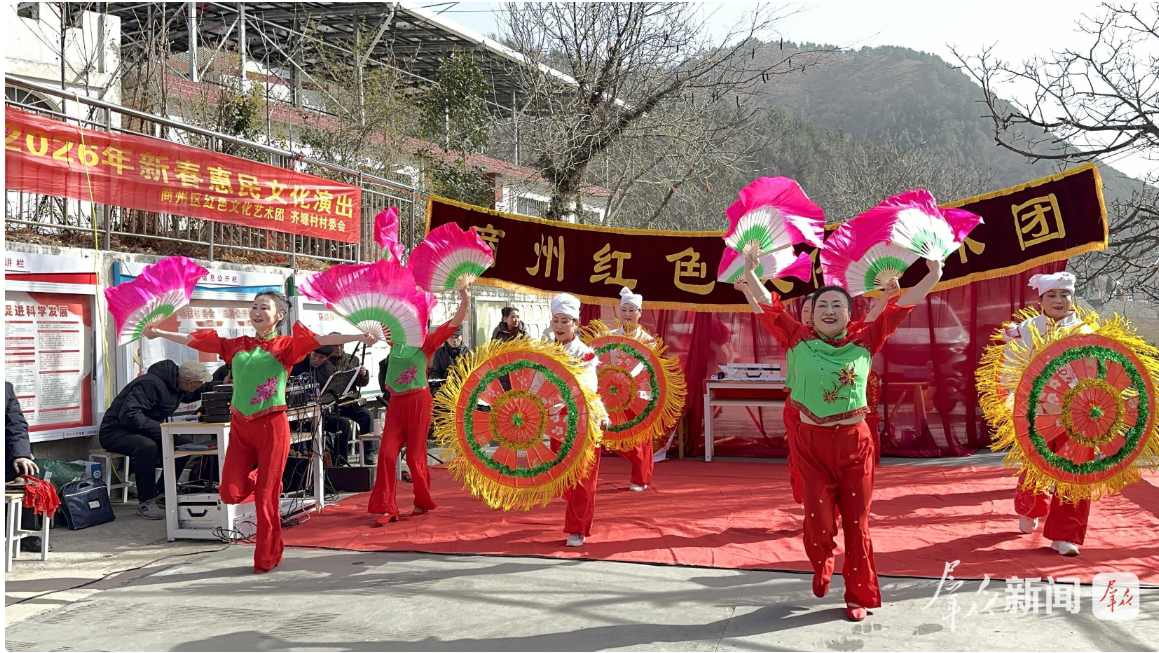 在广场的另一侧,商州区革命老区建设促进会红色文化艺术团的演员们,带来了精心编排的节目。四组村民徐大爷眯着眼睛,手指在膝盖上轻轻打着拍子,听得津津有味。“这戏味儿正!有年头的味道!”他笑着说。而在他的手上,还小心翼翼地拿着一副墨迹刚刚干透的春联。红纸黑字,笔力遒劲,写着“福照家门万事兴,龙腾盛世千家喜”。这墨香扑鼻的祝福,来自一旁的“翰墨送福”区。一副副春联、一个个“福”字,带着手作的温度,被送到乡亲们手中,比印刷品更多了一份人情味和文化感。