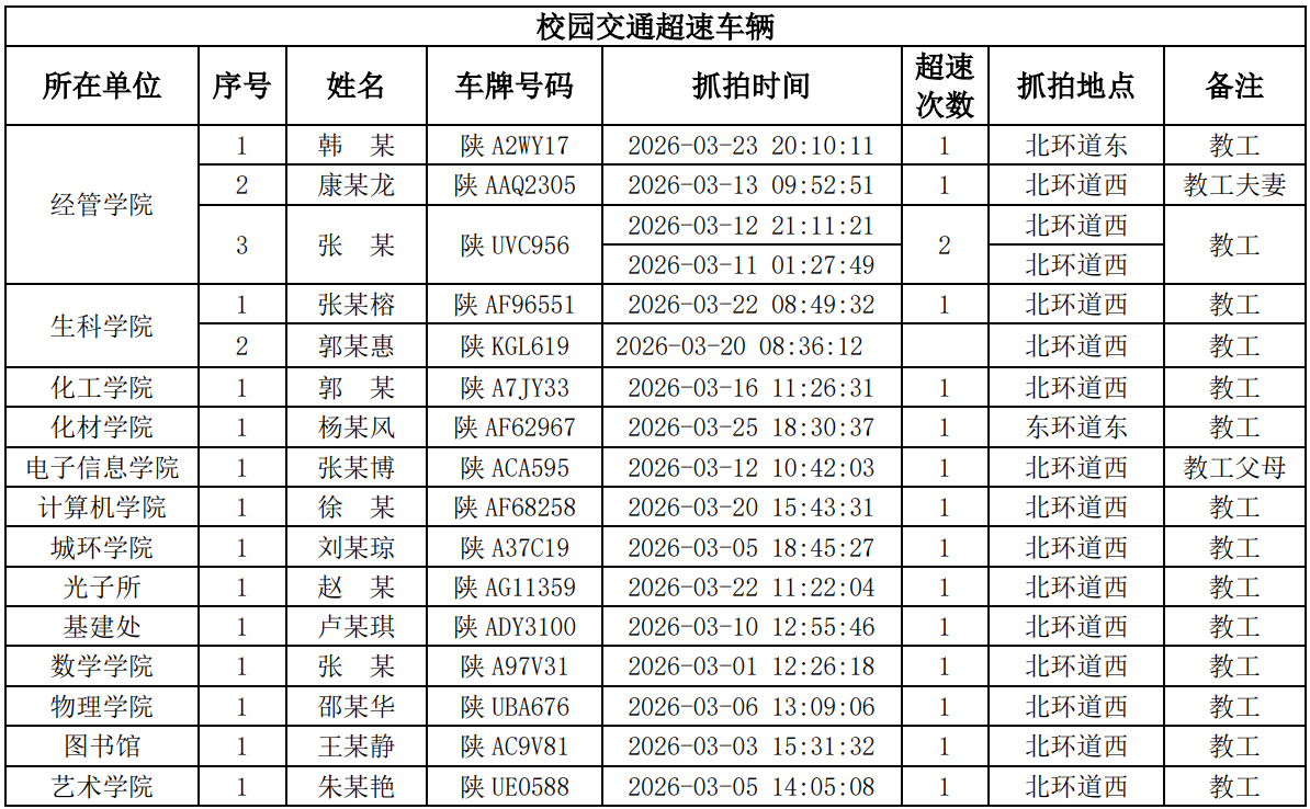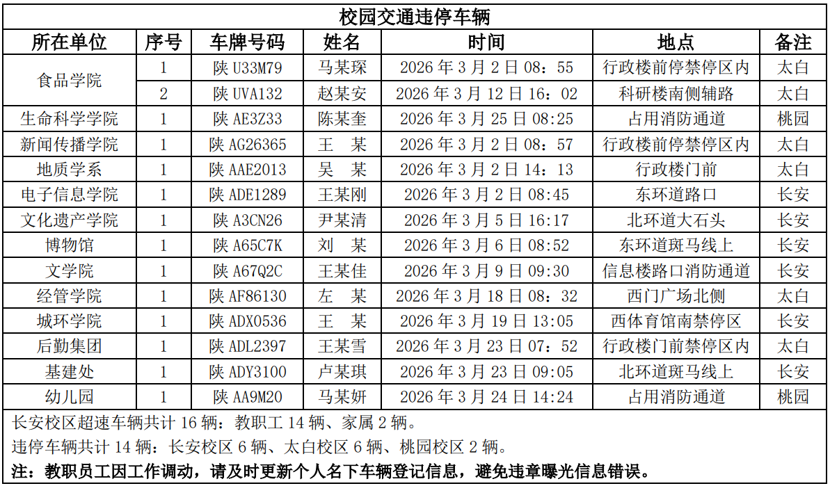 为进一步加强校园交通管理,保障校园交通安全有序,维护学校正常的教学、科研和生活秩序,切实保护师生员工的人身财产安全,根据《西北大学校园交通安全管理规定》的相关要求,现将2026年3月校园交通违章车辆予以曝光,具体要求与违章信息如下: