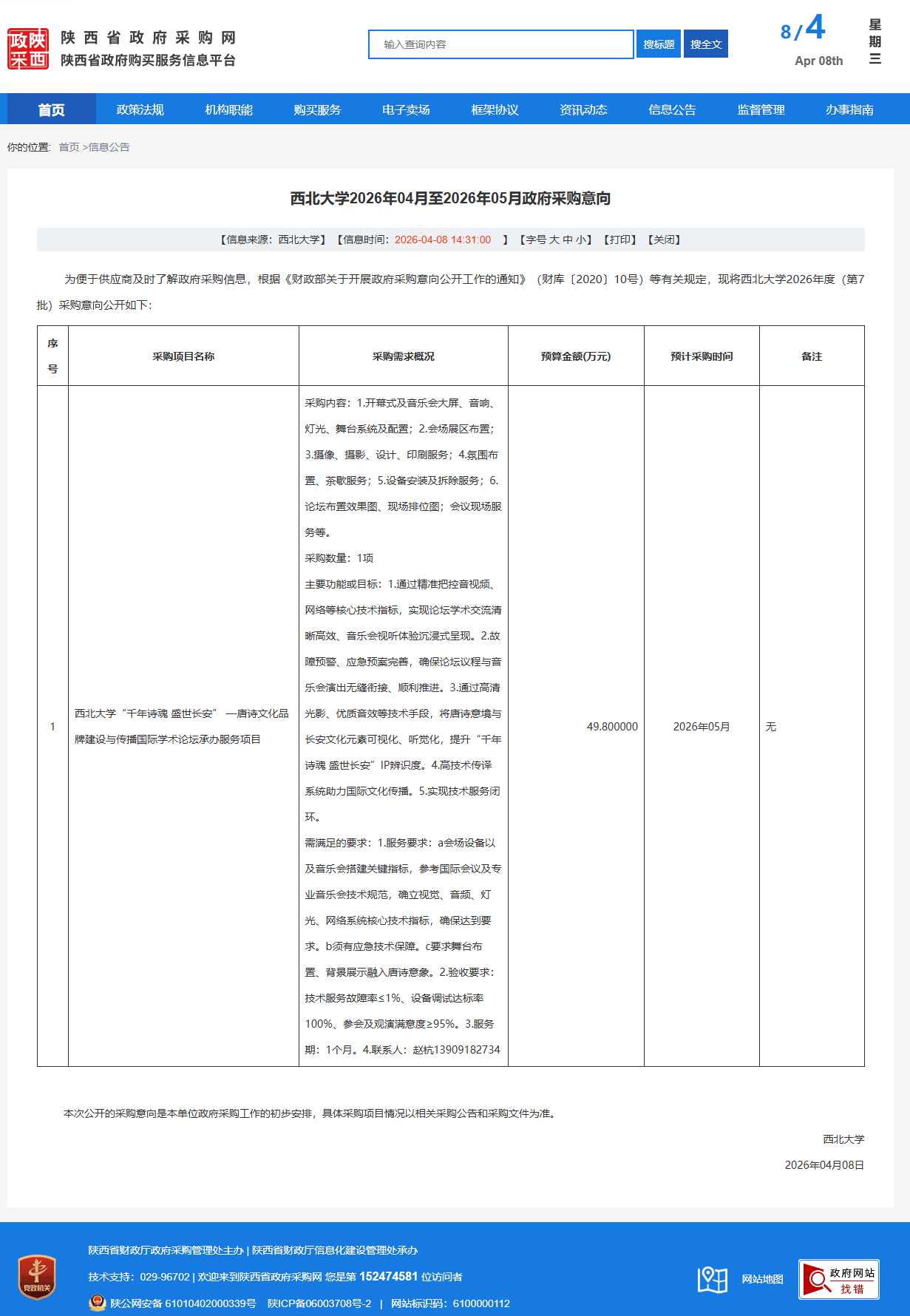西北大学2026年04月至2026年05月政府采购意向