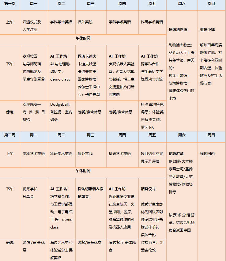 PS: 本次行程计划在当地时间7月26日入住校园,8月7日晚启程出发去伦敦。如因天气,交通,当地治安管控等因素影响,活动内容会适当调整,以开营后实际通知为准。