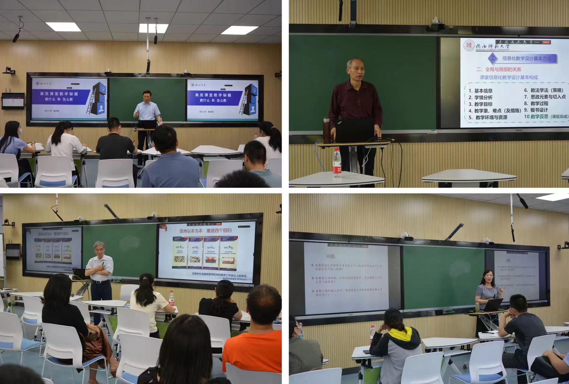 随后的教学名师讲堂,4位校内外教学名师先后开讲。国家级教学名师、陕西师范大学傅钢善教授作了题为“信息技术环境下以学生为中心的教学设计”的专题报告;国家级教学名师、西安交通大学冯博琴教授作了题为“回归本分,以站好讲台为天职”的主题报告;陕西省教学名师、我校曹蓉教授作了题为“新员工的角色适应和心理调适”的专题报告;我校新闻学院周东华教授作了题为“‘言值+颜值’——优质教学的视听元素分析”的主题报告。