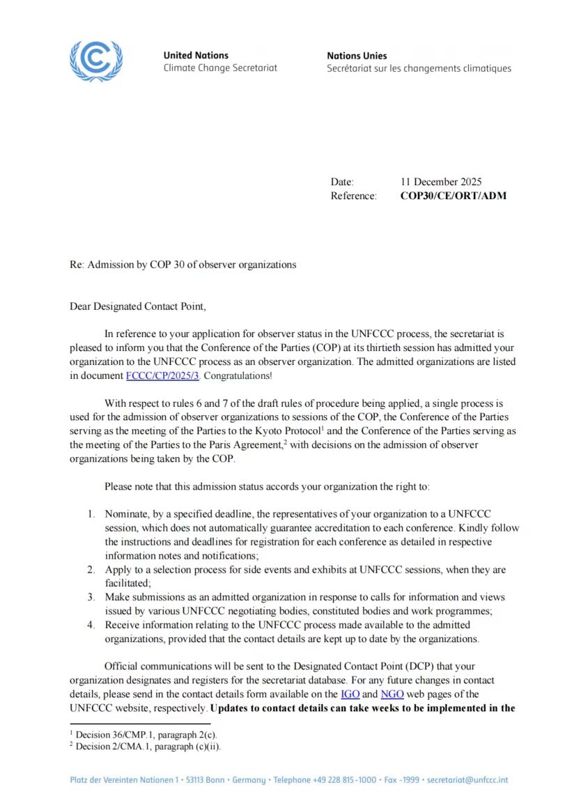 学校将依托UNFCCC观察员身份,持续深耕气候领域科研创新与人才培养,通过组织师生代表团参与缔约方大会(COP)及相关会议、举办主题边会及展览、发布研究报告、提出倡议与建议等方式,与各国代表团及国际组织建立常态化合作机制,以扎实的学术成果、高素质的专业人才和务实的治理行动,切实履行高校服务国家战略、参与全球治理的使命担当。
