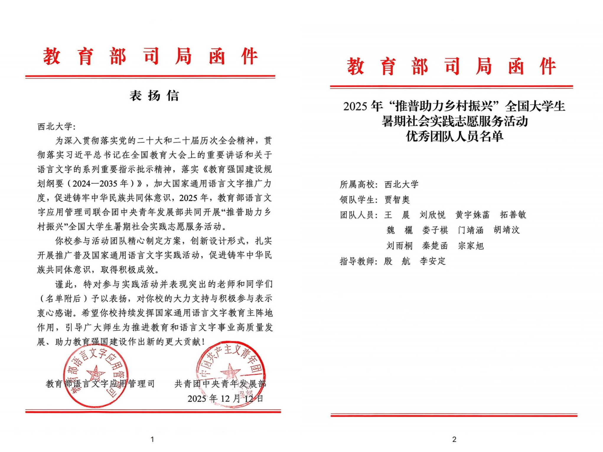 近日,在教育部语言文字应用管理司、共青团中央青年发展部联合开展的 2025 年 “推普助力乡村振兴” 全国大学生暑期社会实践志愿服务活动中,我校新闻传播学院播音与主持艺术专业师生组建的 “启声・经典润乡土” 乡村振兴志愿服务团从全国 2000 支团队中脱颖而出,再度获评 “优秀团队”。同时,两部委向我校致送表扬信,对团队师生深耕基层实践的表现予以充分肯定。