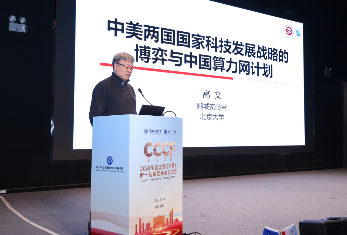 1月24日,中国科学院院士、北京大学教授、鹏城实验室主任高文做客我校“杨钟健学术讲座”,为校内外师生作了题为“中美两国国家科技发展战略的博弈与中国算力网计划”的学术报告。我校党委书记蒋林,计算机学院负责人以及来自全国的特邀嘉宾、学界同仁、师生代表等共同参加了报告会。报告会由中国科学院院士、清华大学教授刘云浩主持。