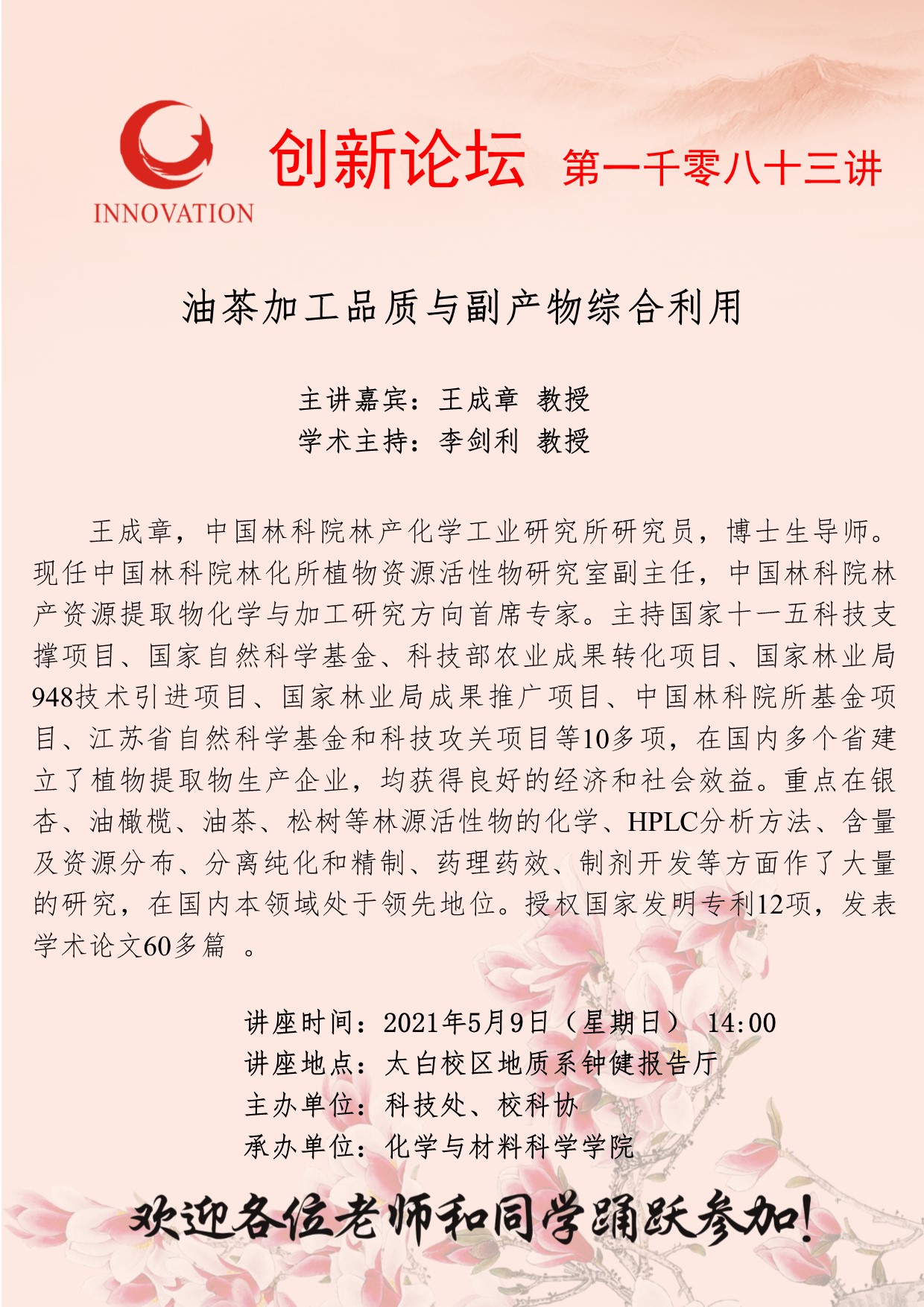 西北大学创新论坛第一千零八十三讲:油茶加工品质与副产物综合利用