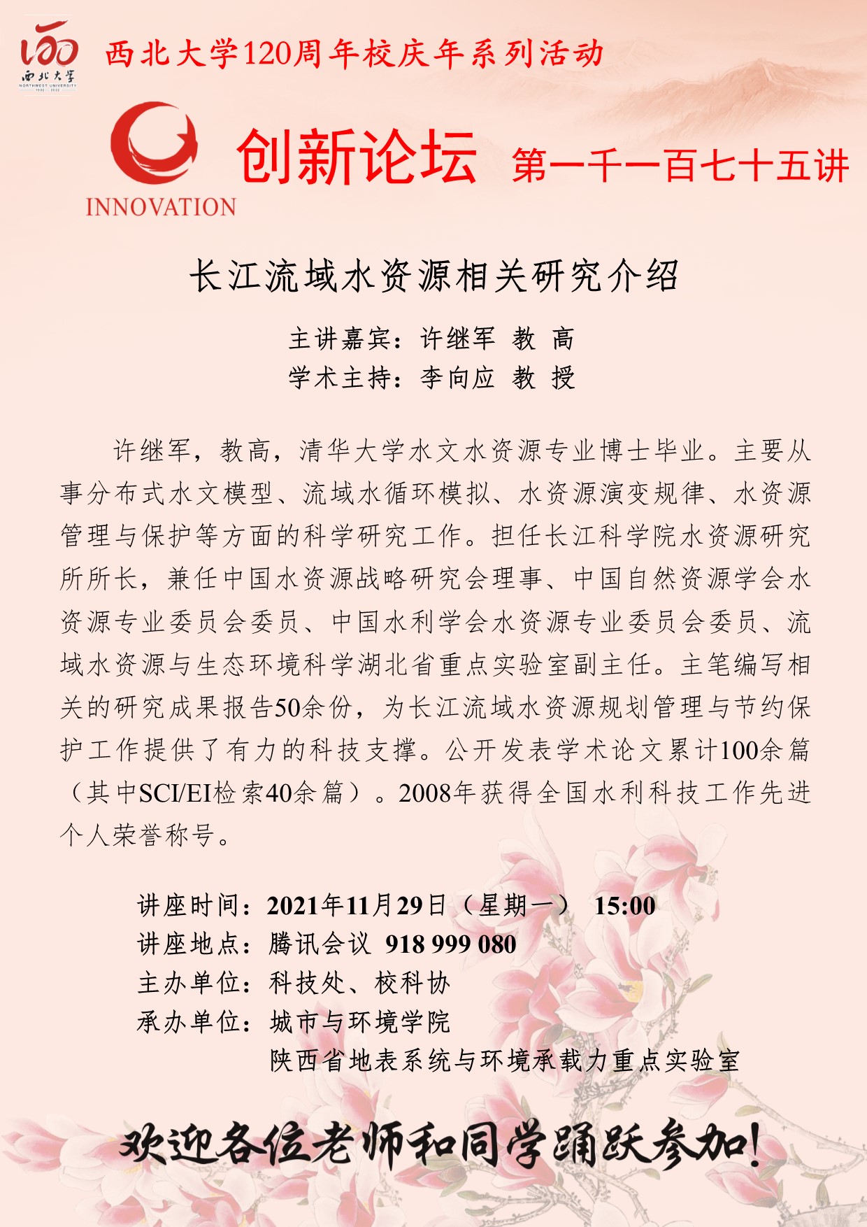 许继军 教高 西北大学创新论坛第一千一百七十五讲暨120周年校庆年系列活动:长江流域水资源相关研究介绍 讲座时间 2021年11月29日(星期一) 15:00 讲座地点 腾讯会议:918999080 讲座人介绍 许继军 教高 讲座内容