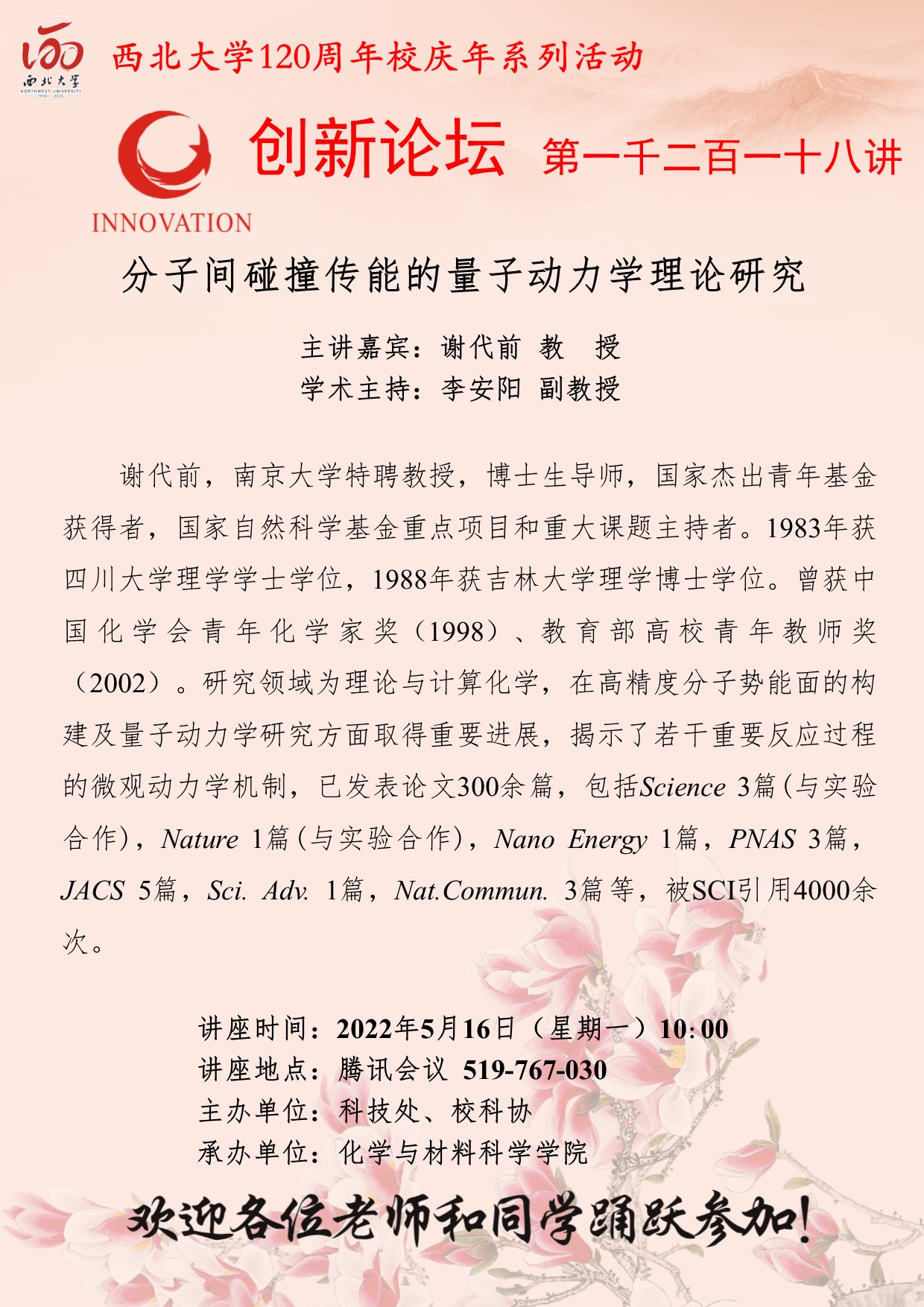 谢代前 教授 西北大学创新论坛第一千二百一十八讲暨120周年校庆年系列活动:分子间碰撞传能的量子动力学理论研究 讲座时间 2022年5月16日(星期一)10:00 讲座地点 腾讯会议 519-767-030 讲座人介绍 谢代前 教授 讲座内容