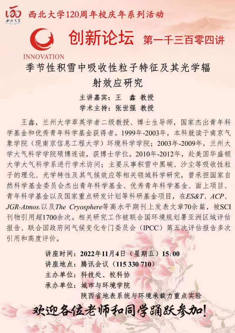 王 鑫 教授 西北大学创新论坛第一千三百零四讲暨120周年校庆年系列活动: 季节性积雪中吸收性粒子特征及其光学辐射效应研究 讲座时间 2022年11月4日(星期五)15:00 讲座地点 腾讯会议 115 330 710 讲座人介绍 王 鑫 教授 讲座内容