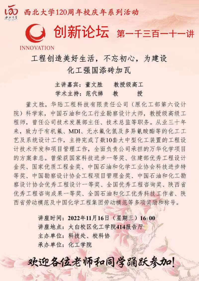 董文胜 教授级高工 西北大学创新论坛第一千三百一十一讲暨120周年校庆年系列活动: 工程创造美好生活,不忘初心,为建设化工强国添砖加瓦 讲座时间 2022年11月16日(星期三)16:00 讲座地点 太白校区化工学院414报告厅 讲座人介绍 董文胜 教授级高工 讲座内容