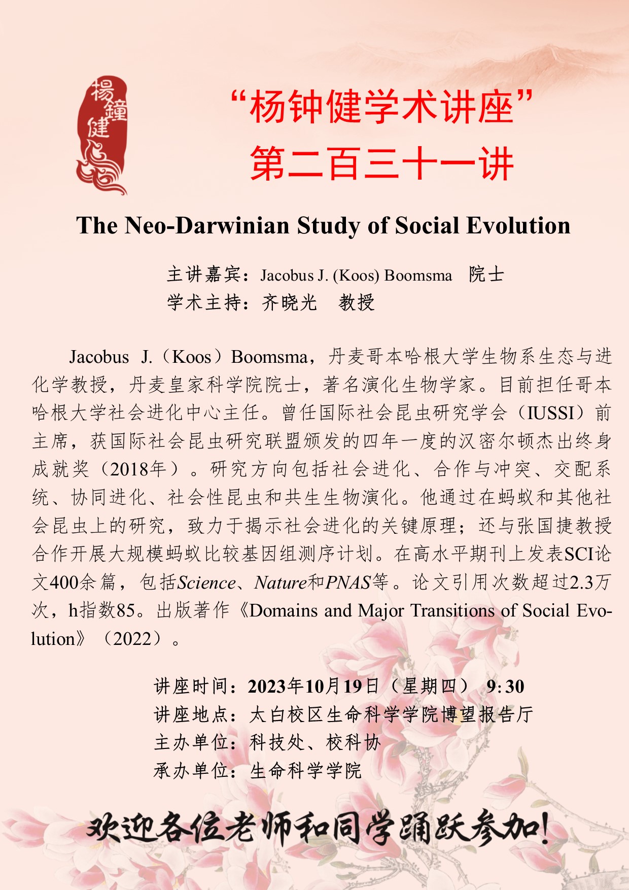 Jacobus J.(Koos) Boomsma 院士 “杨钟健学术讲座”第二百三十一讲:The Neo-Darwinian Study of Social Evolution 讲座时间 2023年10月19日(星期四) 9:30 讲座地点 太白校区生命科学学院博望报告厅 讲座人介绍 Jacobus J.(Koos) Boomsma 院士 讲座内容