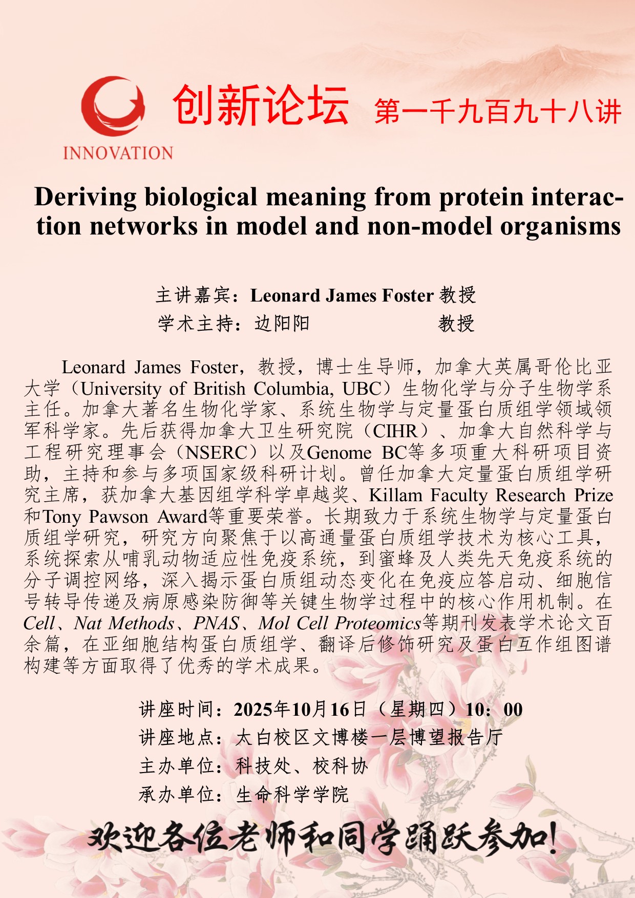 西北大学创新论坛第一千九百九十八讲:Deriving biological meaning from protein interaction networks in model and non-model organisms