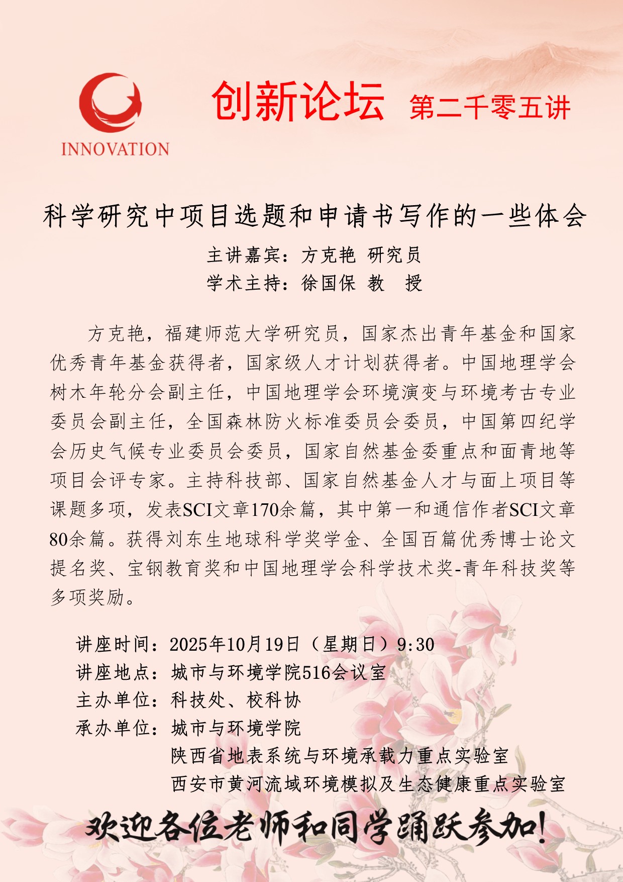 方克艳 研究员 西北大学创新论坛第二千零五讲:科学研究中项目选题和申请书写作的一些体会 讲座时间 2025年10月19日(星期日)9:30 讲座地点 城市与环境学院516会议室 讲座人介绍 方克艳 研究员 讲座内容