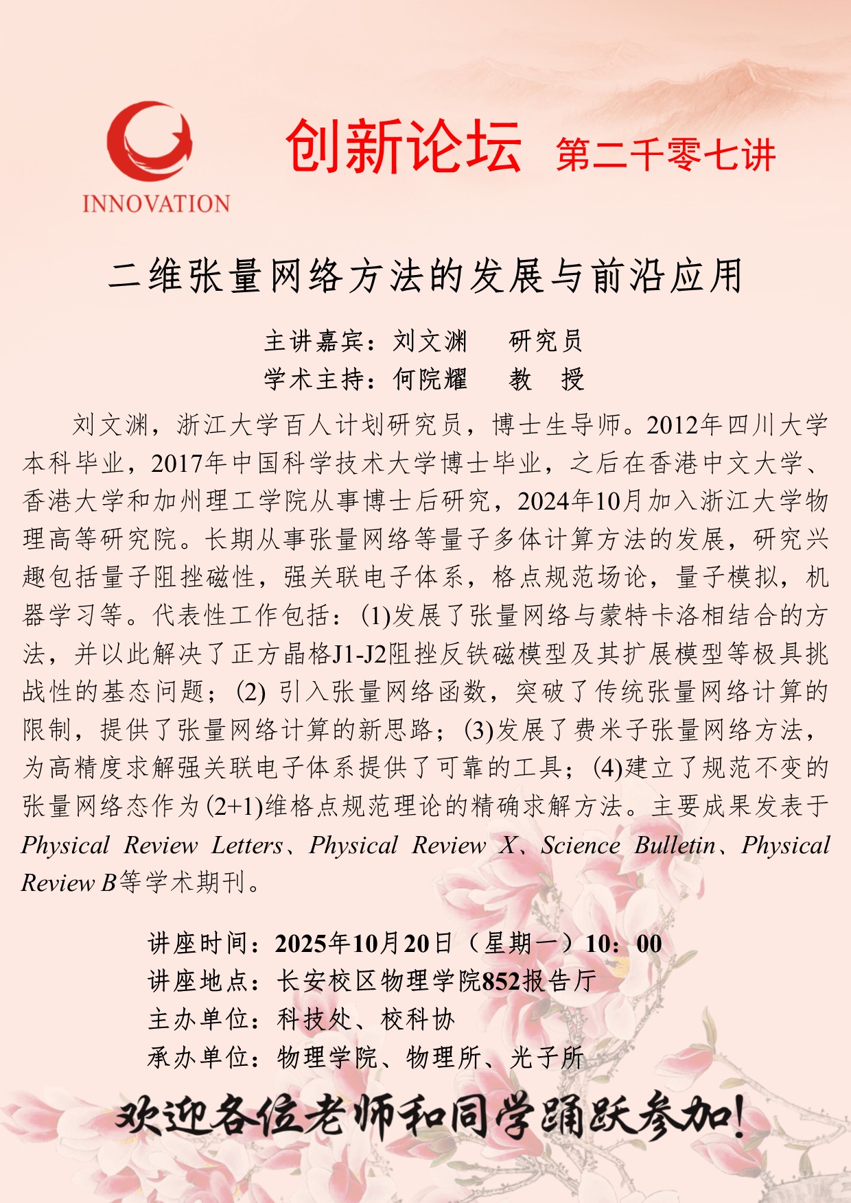 刘文渊 研究员 西北大学创新论坛第二千零七讲:二维张量网络方法的发展与前沿应用 讲座时间 2025年10月20日(星期一)10:00 讲座地点 长安校区物理学院852报告厅 讲座人介绍 刘文渊 研究员 讲座内容