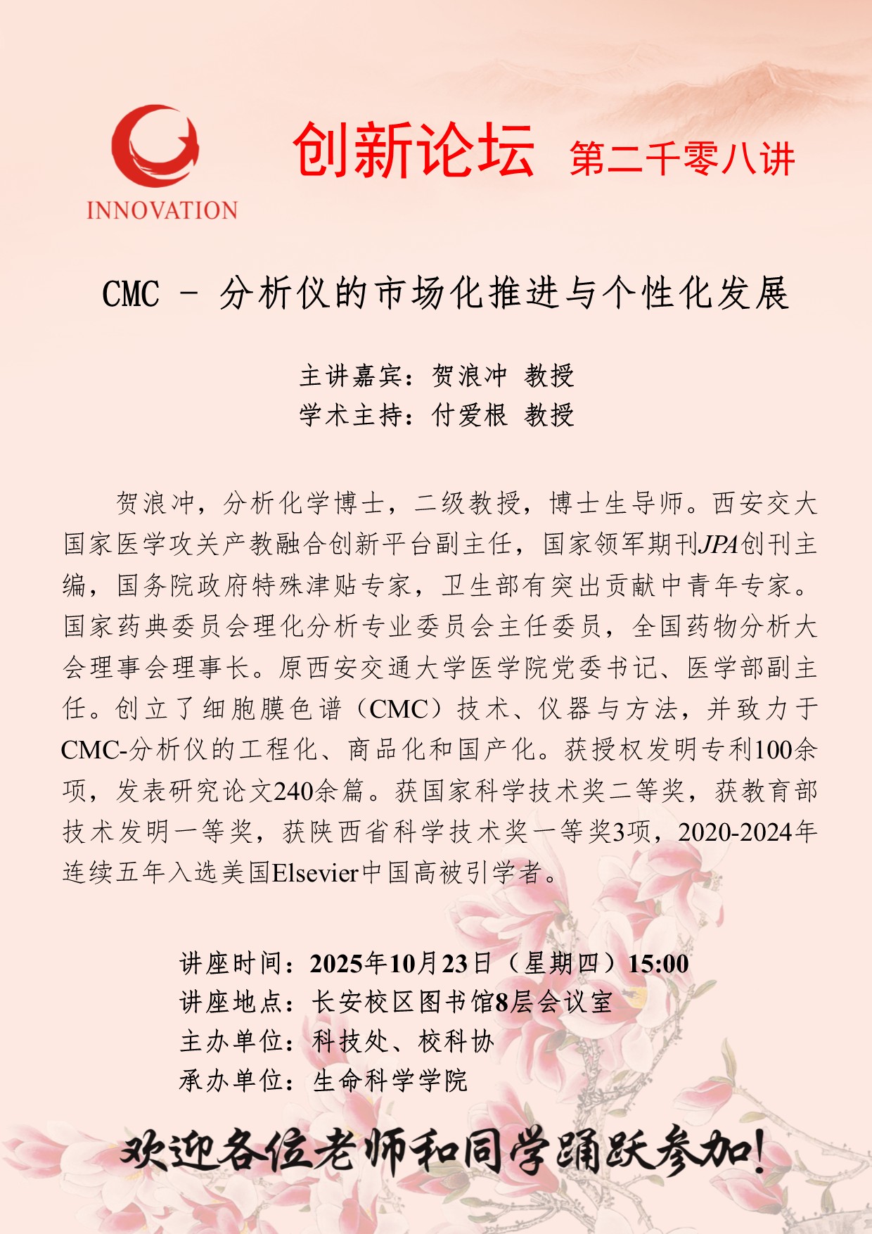 贺浪冲 教授 西北大学创新论坛第二千零八讲:CMC - 分析仪的市场化推进与个性化发展 讲座时间 2025年10月23日(星期四)15:00 讲座地点 讲座地点:长安校区图书馆8层会议室 讲座人介绍 贺浪冲 教授 讲座内容