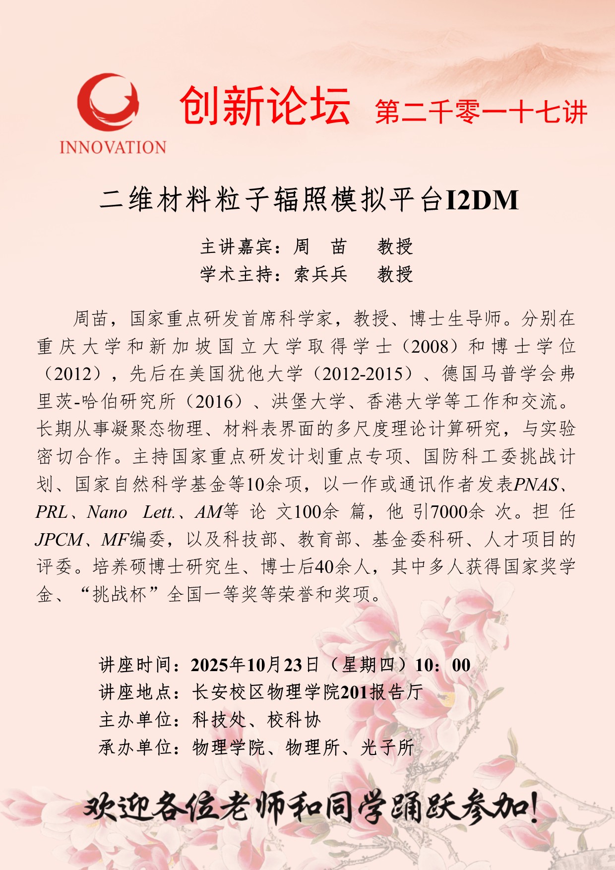 周苗 教授 西北大学创新论坛第二千零一十七讲:二维材料粒子辐照模拟平台I2DM 讲座时间 2025年10月23日(星期四)10:00 讲座地点 长安校区物理学院201报告厅 讲座人介绍 周苗 教授 讲座内容
