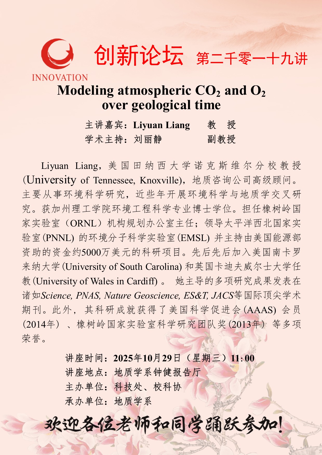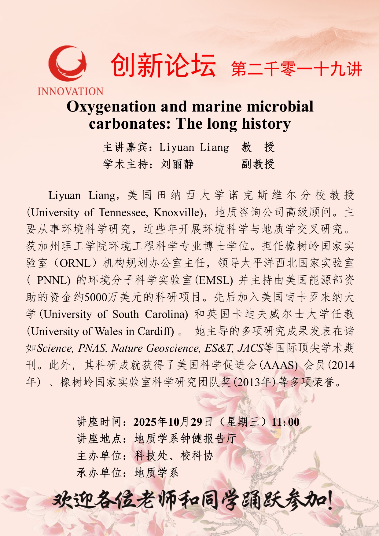 Liyuan Liang 教授 西北大学创新论坛第二千零一十九讲:Oxygenation and marine microbial carbonates: The long history 讲座时间 2025年10月29日(星期三)11:00 讲座地点 地质学系钟健报告厅 讲座人介绍 Liyuan Liang 教授 讲座内容