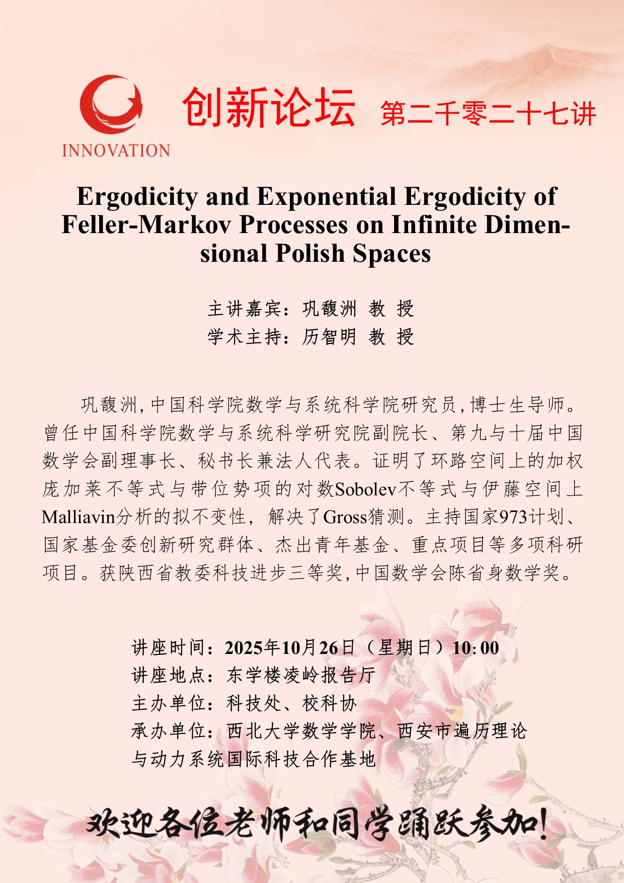 巩馥洲 教 授 西北大学创新论坛第二千零二十七讲:Ergodicity and Exponential Ergodicity of Feller-Markov Processes on Infinite Dimensional Polish Spaces 讲座时间 2025年10月26日(星期日)10:00 讲座地点 东学楼凌岭报告厅 讲座人介绍 巩馥洲 教 授 讲座内容