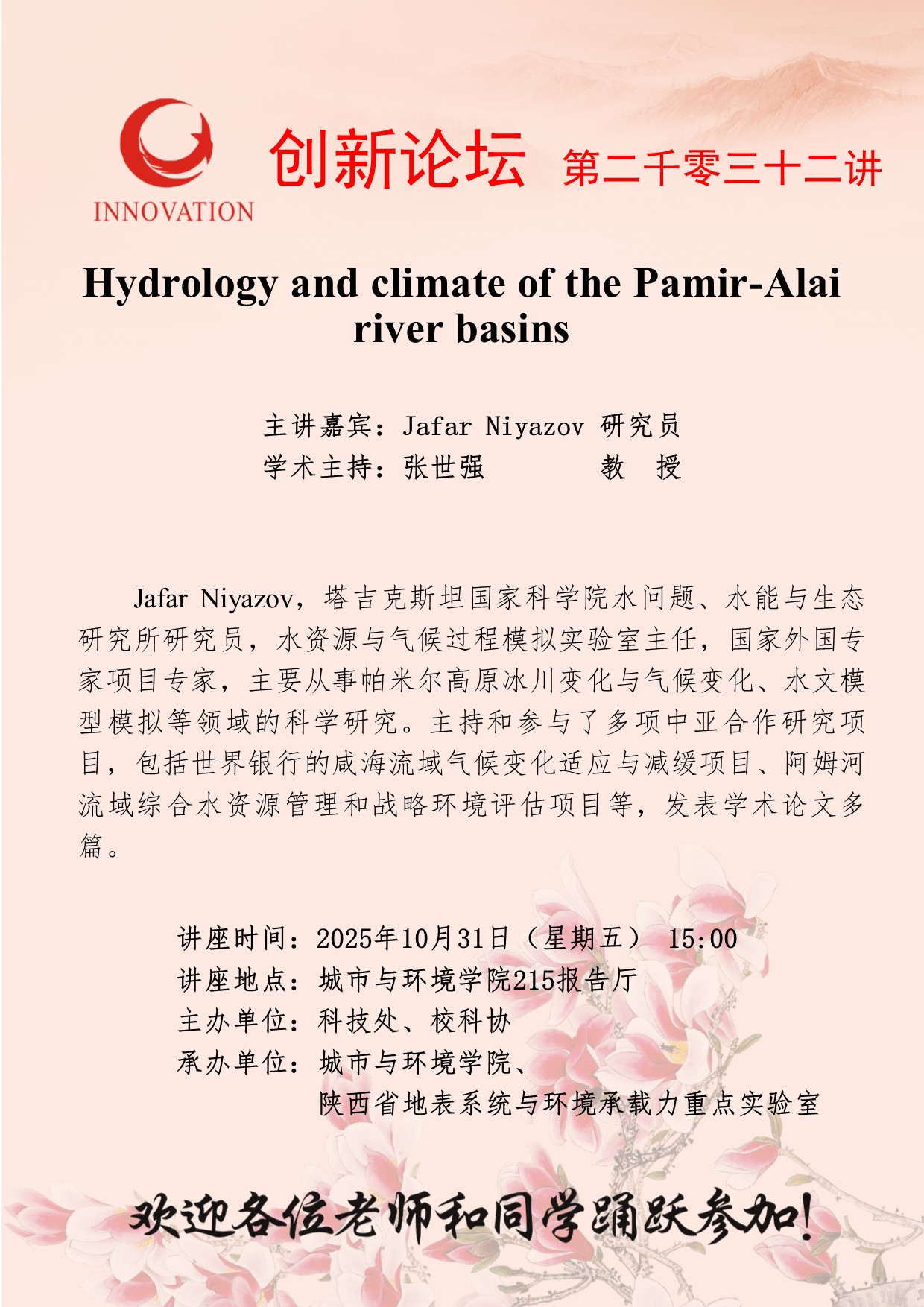 Jafar Niyazov 研究员 西北大学创新论坛第二千零三十二讲:Hydrology and climate of the Pamir-Alai river basins 讲座时间 2025年10月31日(星期五) 15:00 讲座地点 城市与环境学院215报告厅 讲座人介绍 Jafar Niyazov 研究员 讲座内容