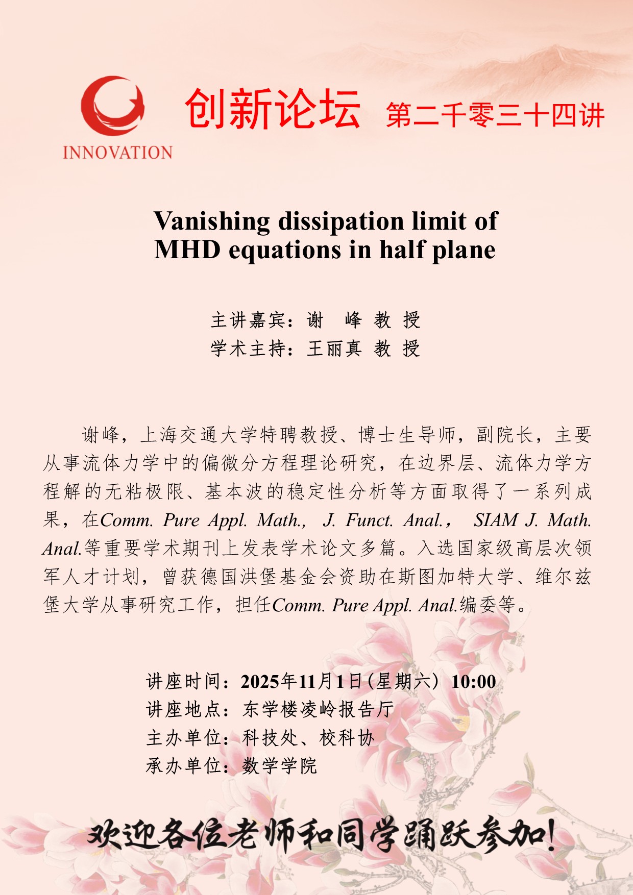 谢 峰 教 授 西北大学创新论坛第二千零三十四讲:Vanishing dissipation limit of MHD equations in half plane 讲座时间 2025年11月1日(星期六) 10:00 讲座地点 东学楼凌岭报告厅 讲座人介绍 谢 峰 教 授 讲座内容