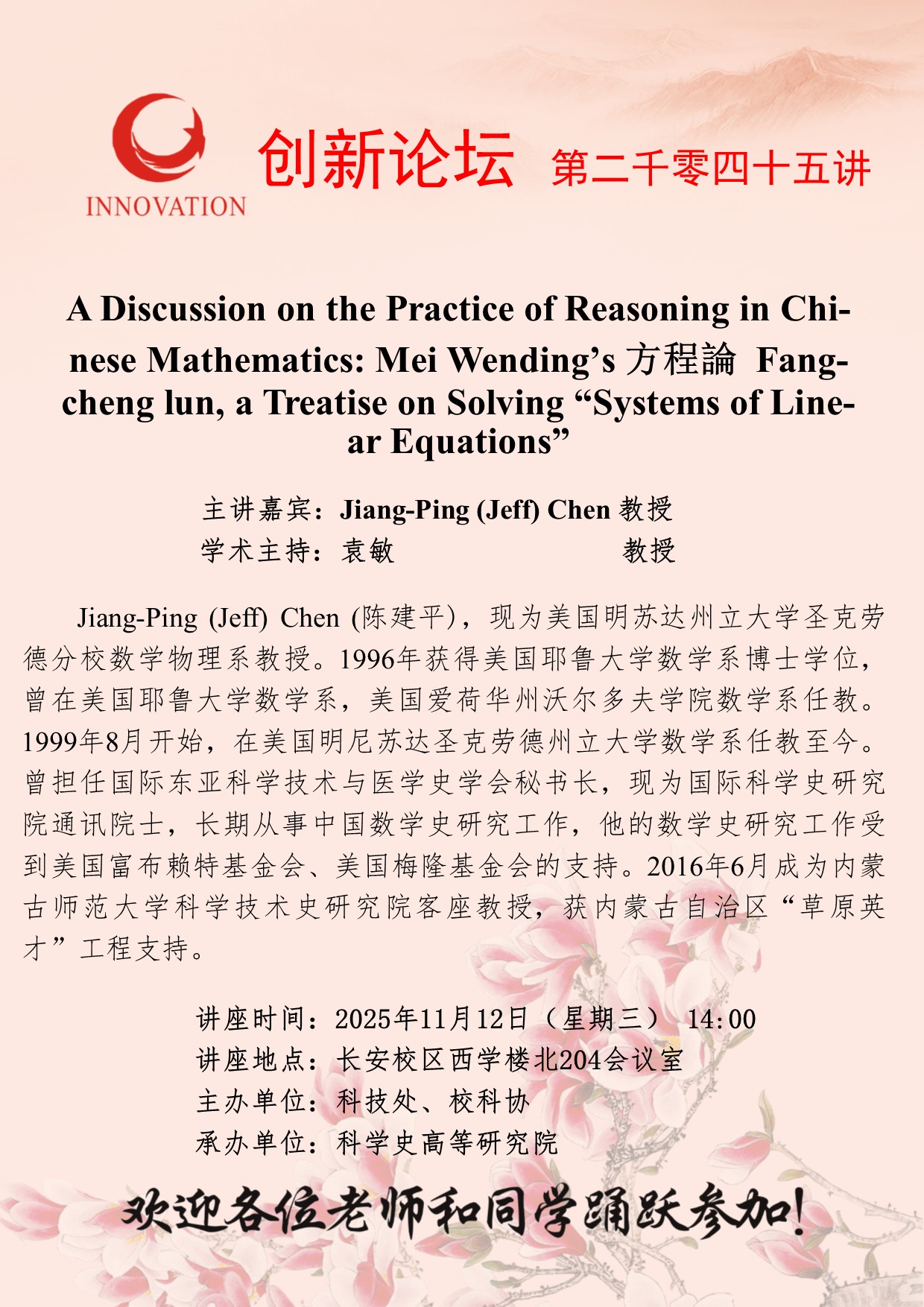 Jiang-Ping (Jeff) Chen 教授 西北大学创新论坛第二千零四十五讲:A Discussion on the Practice of Reasoning in Chinese Mathematics: Mei Wending’s 方程論 Fangcheng lun, a Treatise on Solving “Systems of Linear Equations” 讲座时间 2025年11月12日(星期三) 14:00 讲座地点 长安校区西学楼北204会议室 讲座人介绍 Jiang-Ping (Jeff) Chen 教授 讲座内容