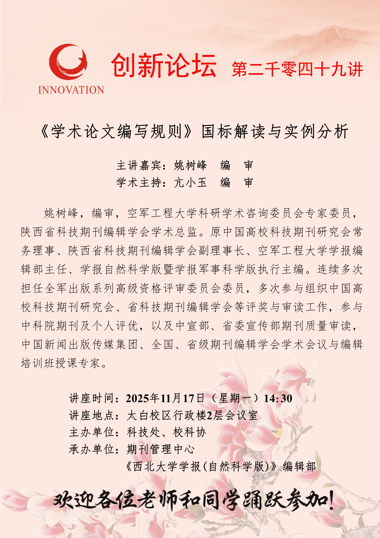 姚树峰 编审 西北大学创新论坛第二千零四十九讲:《学术论文编写规则》国标解读与实例分析 讲座时间 2025年11月17日(星期一)14:30 讲座地点 太白校区行政楼2层会议室 讲座人介绍 姚树峰 编审 讲座内容