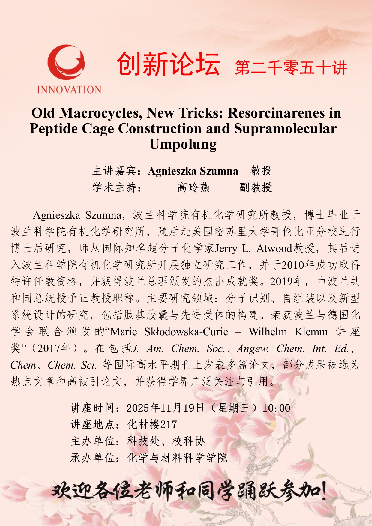 Agnieszka Szumna 教授 西北大学创新论坛第二千零五十讲:Old Macrocycles, New Tricks: Resorcinarenes in Peptide Cage Construction and Supramolecular Umpolung 讲座时间 2025年11月19日(星期三)10:00 讲座地点 化材楼217 讲座人介绍 Agnieszka Szumna 教授 讲座内容