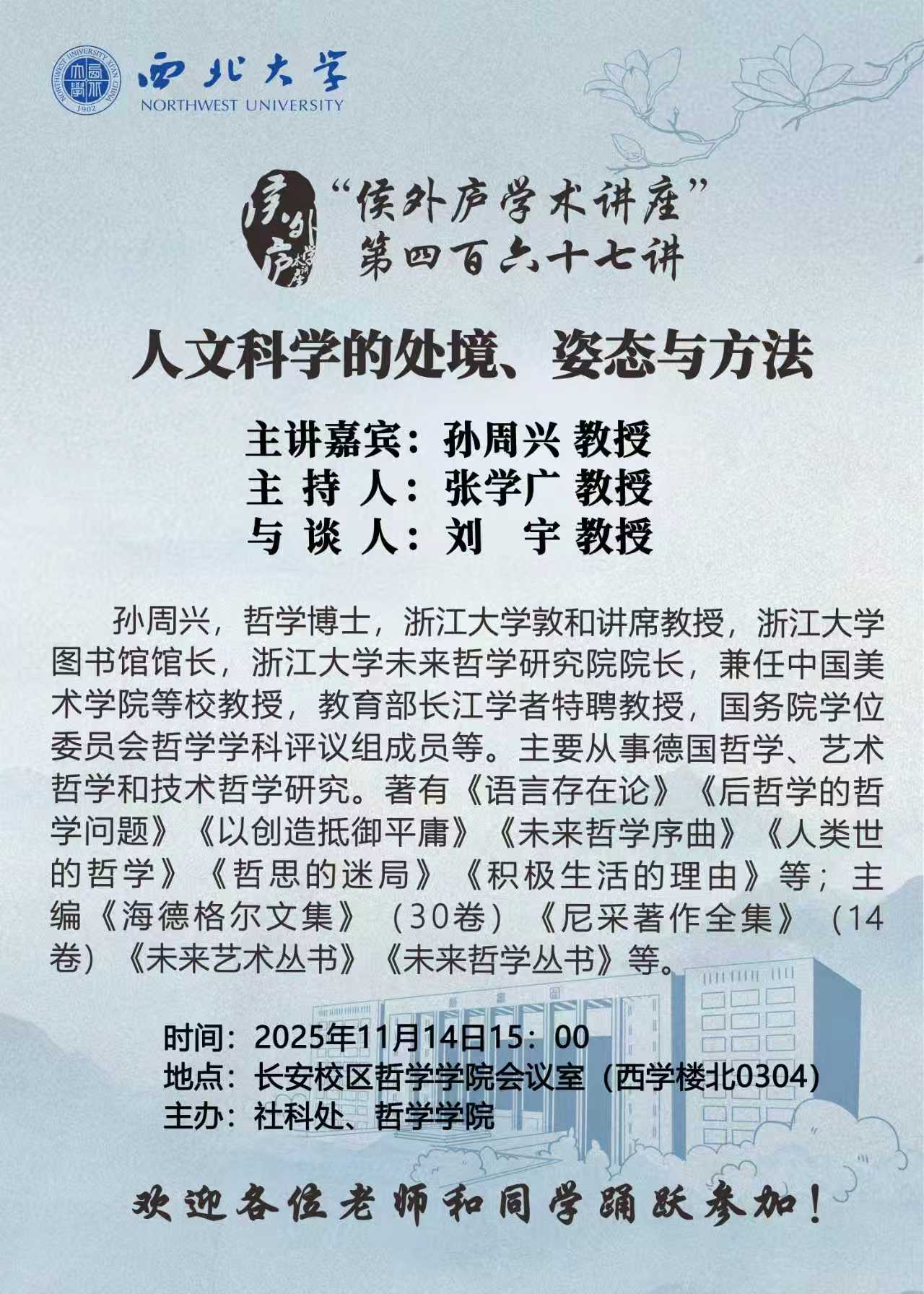 孙周兴 教授 “侯外庐学术讲座”第四百六十七讲:人文科学的处境、姿态与方法 讲座时间 2025年11月14日15:00 讲座地点 长安校区哲学学院会议室(西学楼北0304) 讲座人介绍 孙周兴 教授 讲座内容