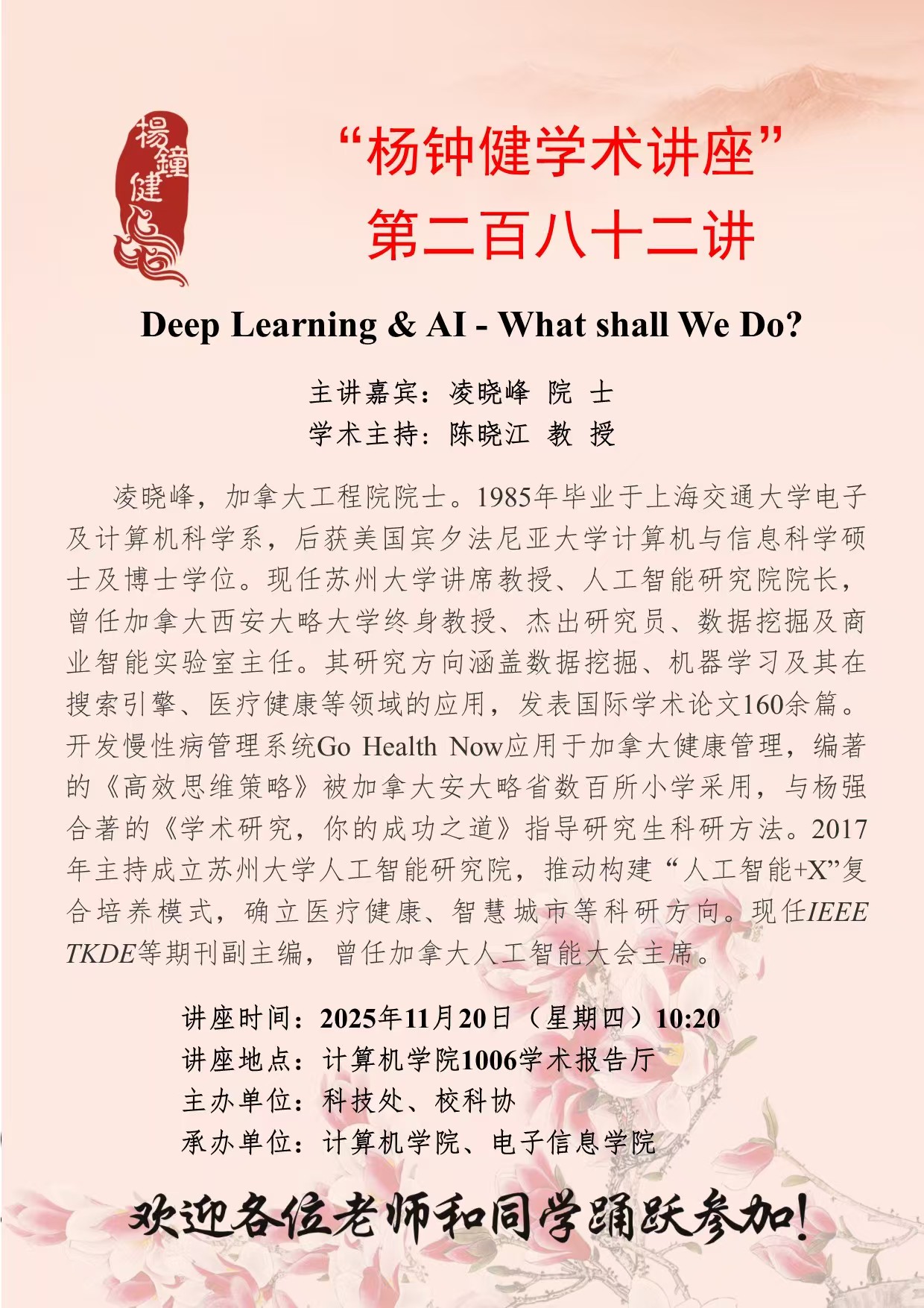 凌晓峰 院士 “杨钟健学术讲座”第二百八十二讲:Deep Learning & AI - What shall We Do? 讲座时间 2025年11月20日(星期四)10:20 讲座地点 计算机学院1006学术报告厅 讲座人介绍 凌晓峰 院士 讲座内容