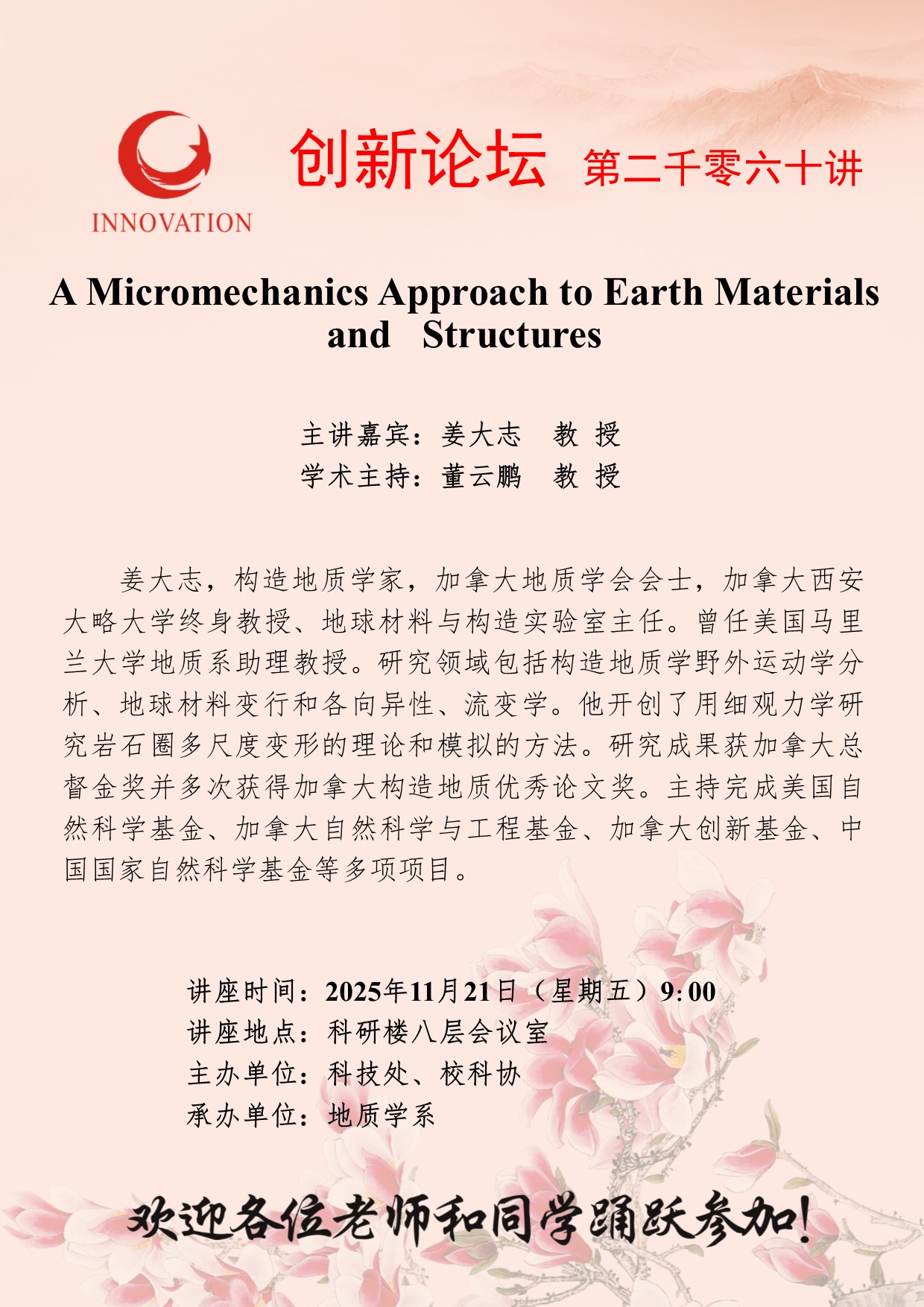 姜大志 教授 西北大学创新论坛第二千零六十讲:A Micromechanics Approach to Earth Materials and Structures 讲座时间 2025年11月21日(星期五)9:00 讲座地点 科研楼八层会议室 讲座人介绍 姜大志 教授 讲座内容