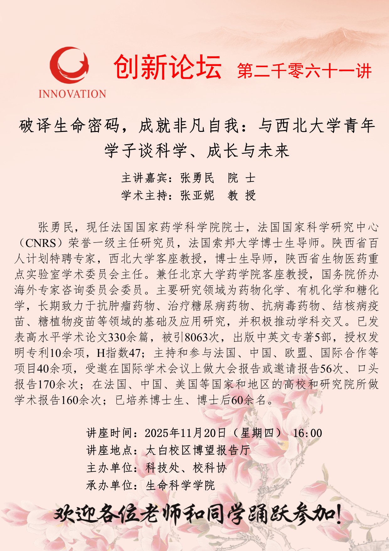 张勇民 院士 西北大学创新论坛第二千零六十一讲:破译生命密码,成就非凡自我:与西北大学青年学子谈科学、成长与未来 讲座时间 2025年11月20日(星期四) 16:00 讲座地点 太白校区博望报告厅 讲座人介绍 张勇民 院士 讲座内容
