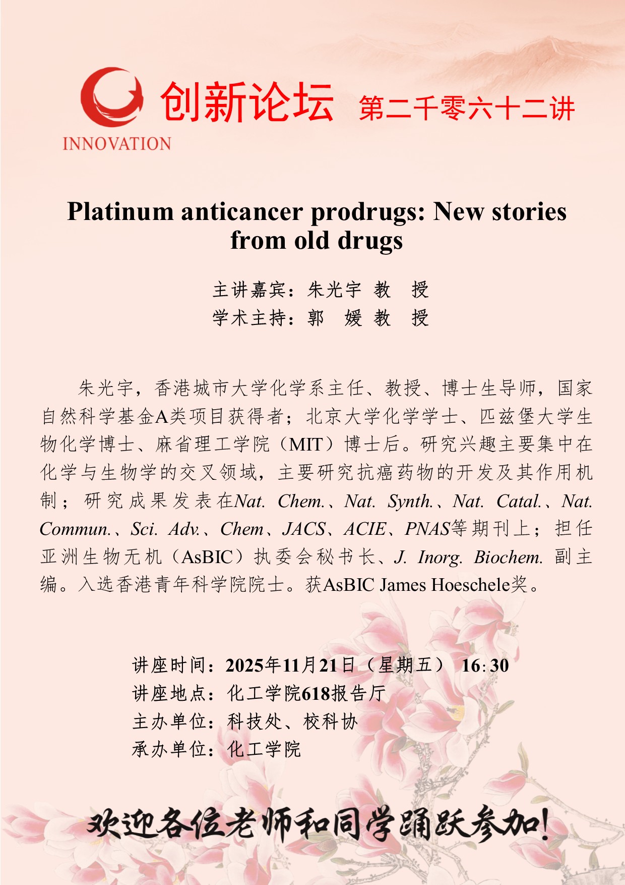 朱光宇 教授 西北大学创新论坛第二千零六十二讲:Platinum anticancer prodrugs: New stories from old drugs 讲座时间 2025年11月21日(星期五) 16:30 讲座地点 化工学院618报告厅 讲座人介绍 朱光宇 教授 讲座内容