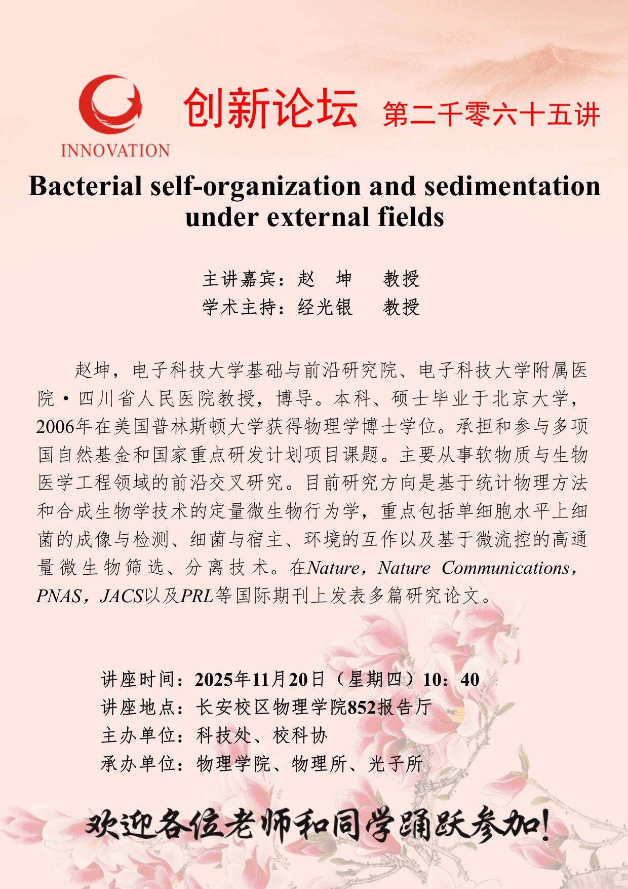 赵坤 教授 西北大学创新论坛第二千零六十五讲:Bacterial self-organization and sedimentation under external fields 讲座时间 2025年11月20日(星期四)10:40 讲座地点 长安校区物理学院852报告厅 讲座人介绍 赵坤 教授 讲座内容