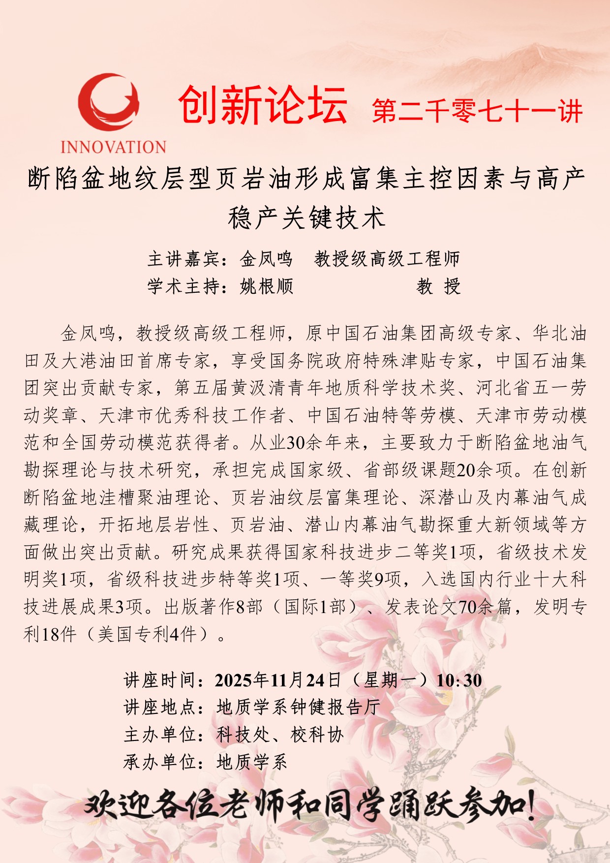 金凤鸣 教授级高级工程师 西北大学创新论坛第二千零七十一讲:断陷盆地纹层型页岩油形成富集主控因素与高产稳产关键技术 讲座时间 2025年11月24日(星期一)10:30 讲座地点 地质学系钟健报告厅 讲座人介绍 金凤鸣 教授级高级工程师 讲座内容